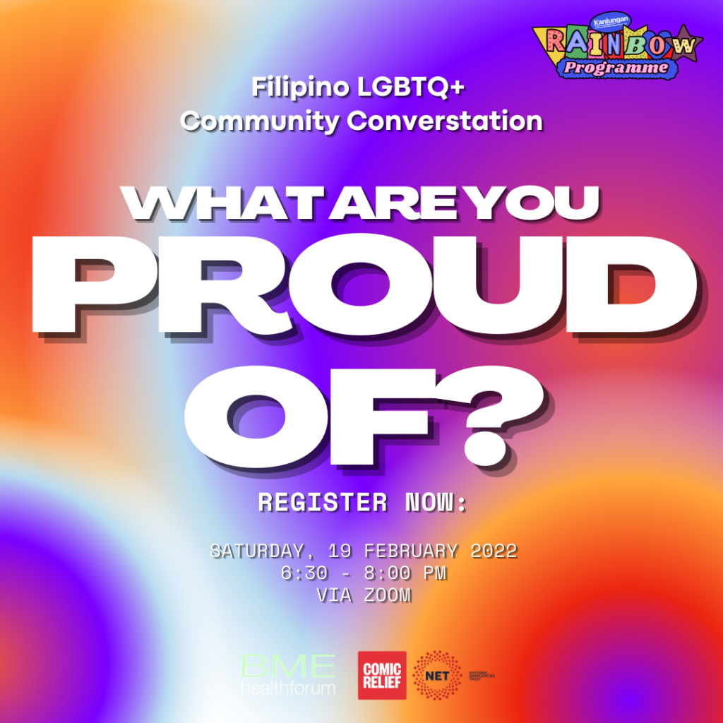 Filipino LGBTQ+ Community Conversation: What are you proud of? Join our Filipino LGBTQ+ Community Conversation. Save the date: Saturday, 19 February 2022 from 6:00 – 7:30 PM via Zoom